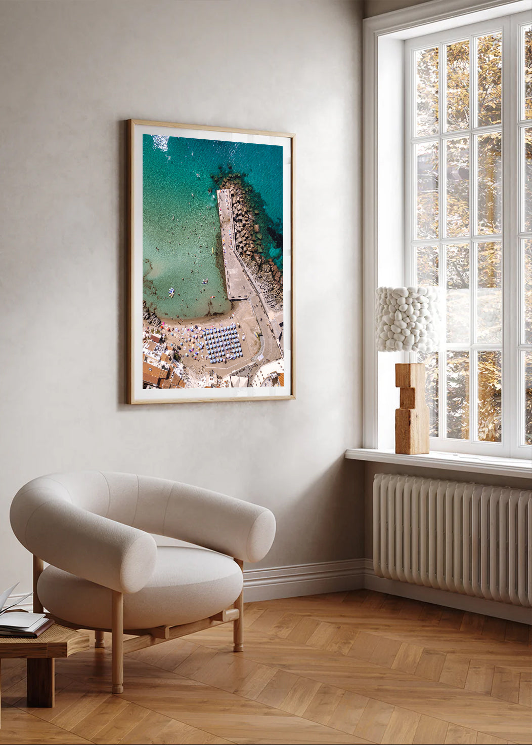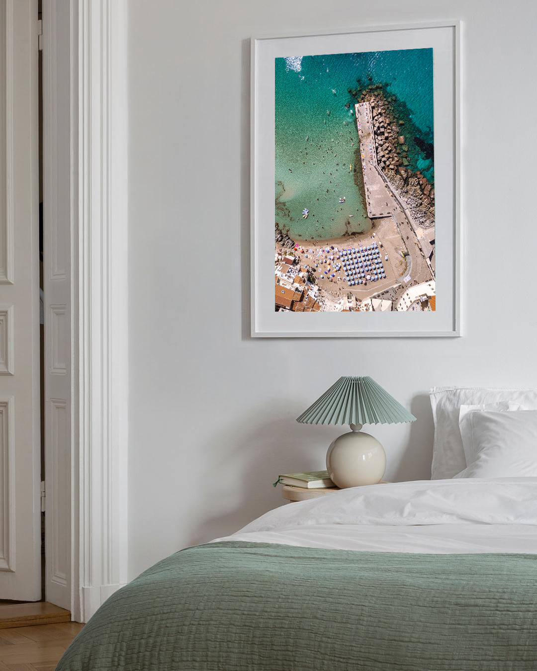 Seen from above, the image highlights the relationship between shoreline, structure, and sea, with clear lines and coastal tones that suit a wide range of interiors. Its vertical orientation works particularly well in hallways, entryways, and narrower wall spaces, or as part of a travel and coastal gallery wall.