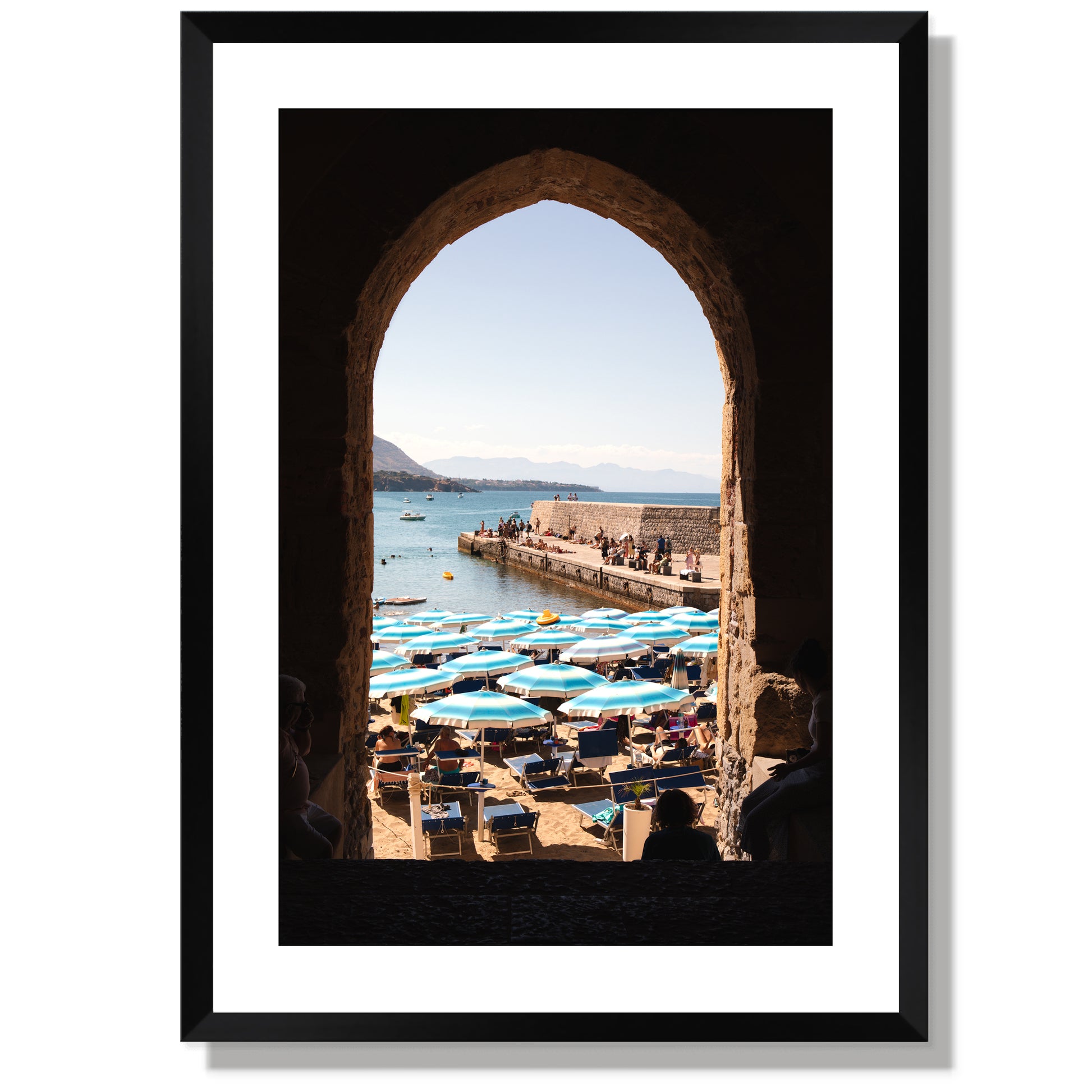 Porta Pescara, Cefalù is a coastal photography print taken in Cefalù, Sicily, featuring the iconic stone archway that leads through the old town to Spiaggia del Porto Vecchio.