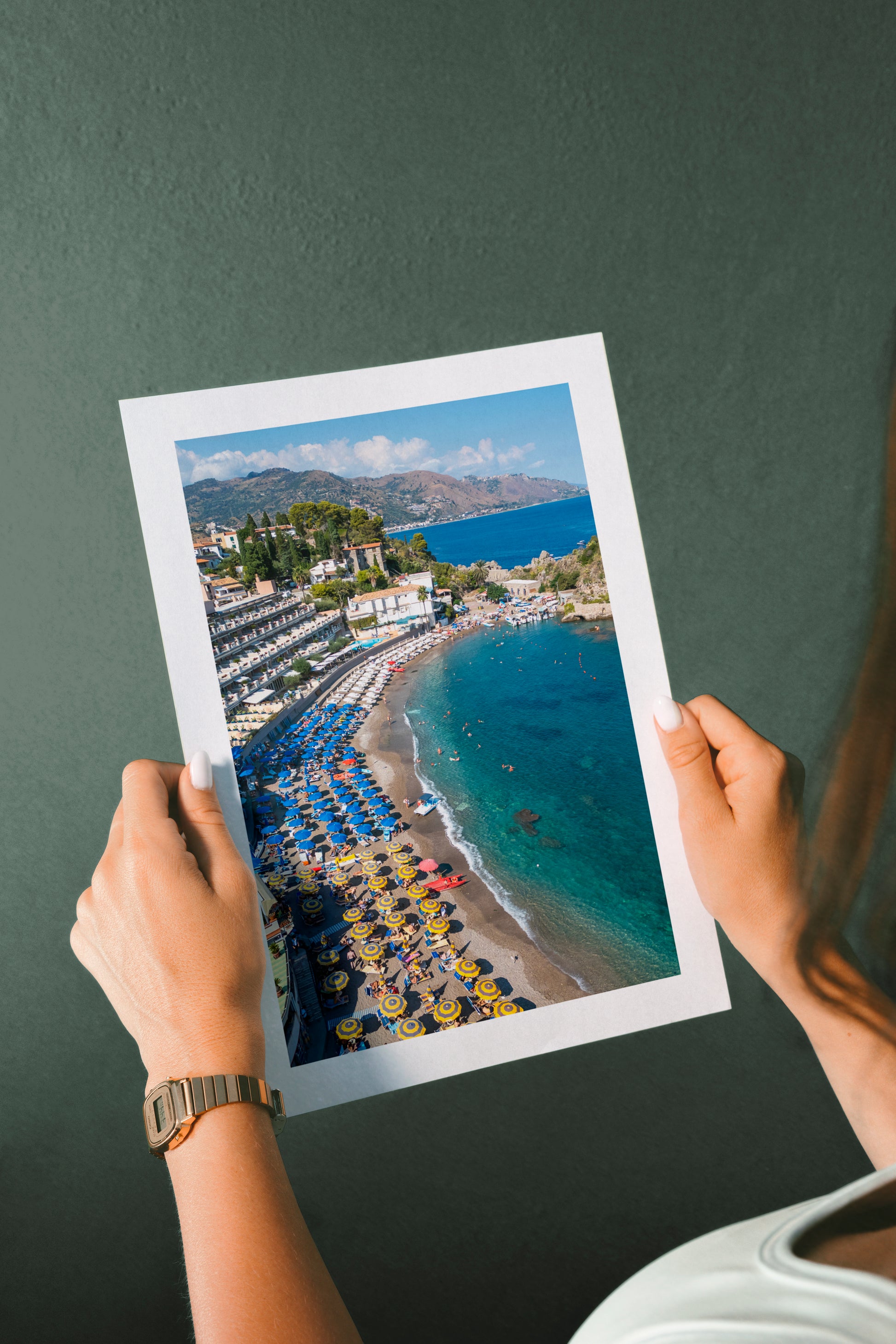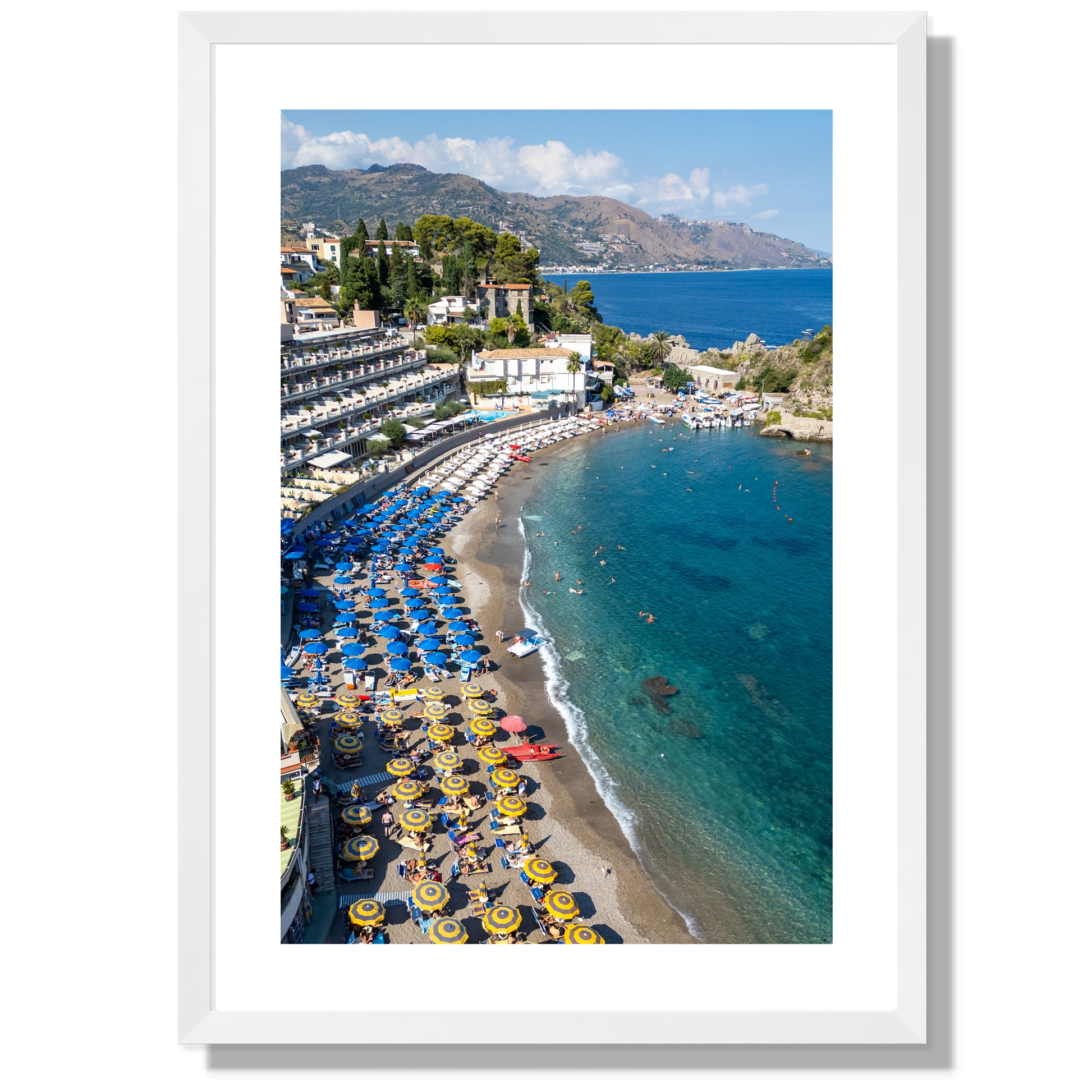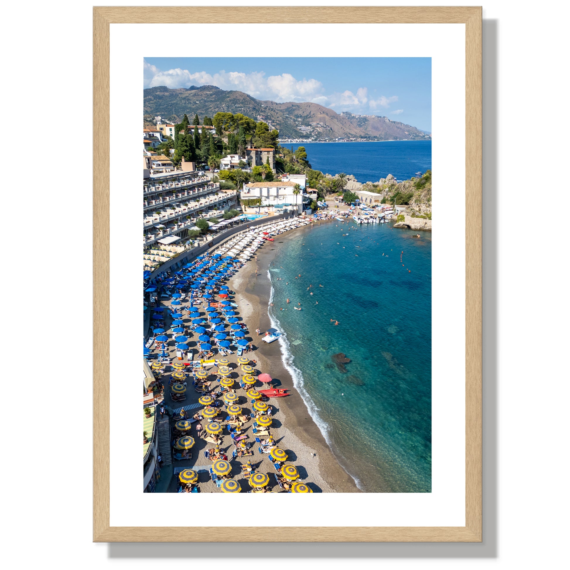 Captured from directly above, this aerial portrait print offers an intimate look at Spiaggia di Mazzarò. The frame reveals rows of colourful umbrellas and beach chairs neatly scattered across golden sand, with crystal-clear turquoise water lapping at the edge.