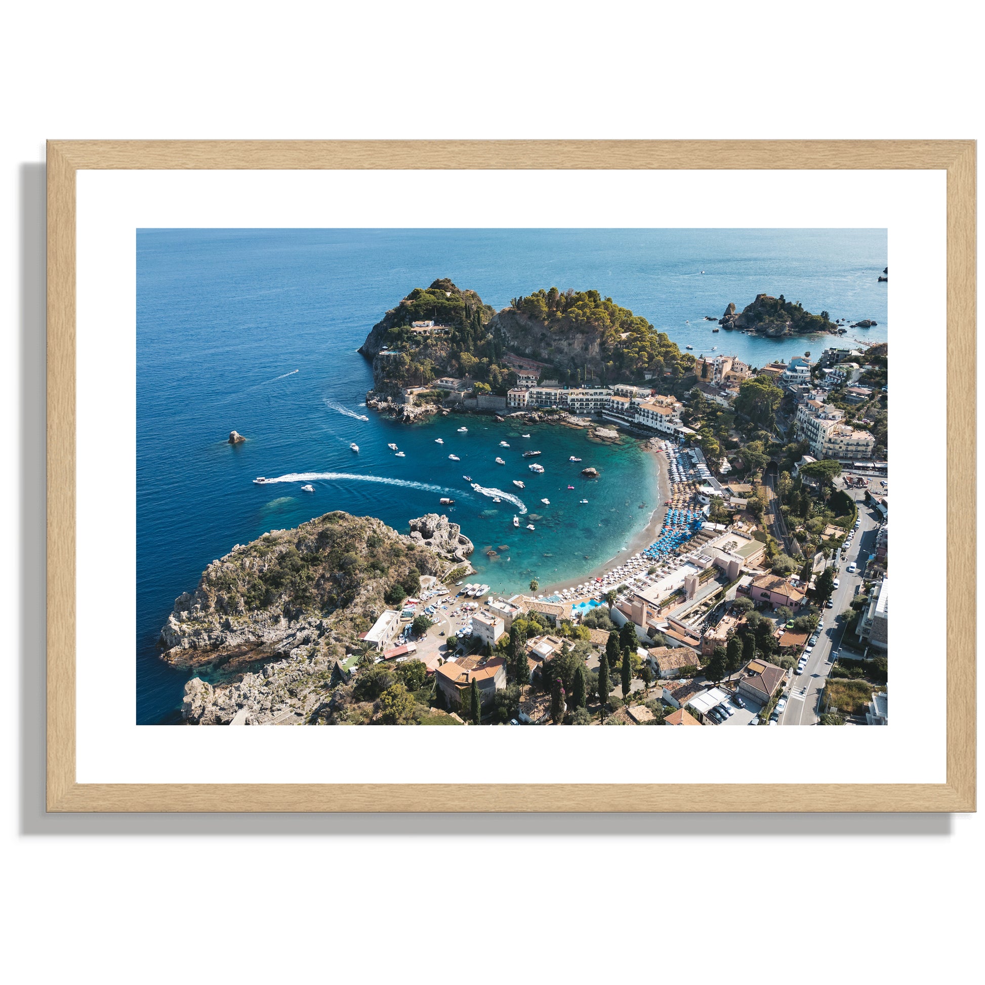 This landscape-format aerial print captures the iconic Spiaggia di Mazzarò from a sweeping inland angle, revealing rich Mediterranean blues stretching out toward the horizon. The expansive view highlights Sicily’s stunning coastline, with boats dotting the bay and golden sand curving along the shore.
