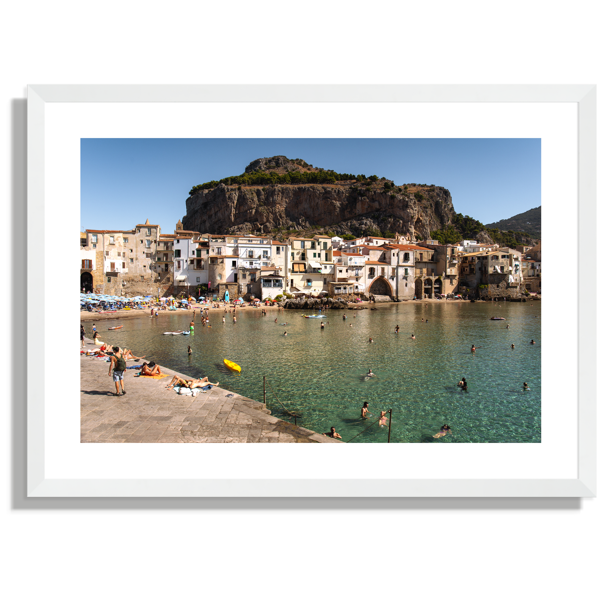 This image captures the relationship between Cefalù’s old town architecture and the sea, with warm building textures and coastal tones that suit a range of interiors. Its wide composition works particularly well above sofas, beds, consoles, or along larger wall spaces, and pairs easily with other travel and coastal prints.